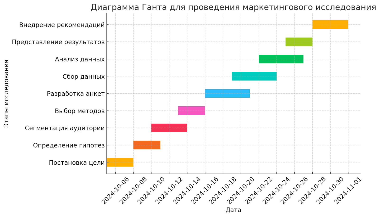 Чтобы провести маркетинговое исследование эффективно, нужно следовать четко структурированному плану, который охватывает все ключевые этапы — от постановки целей до анализа данных и внедрения результатов.